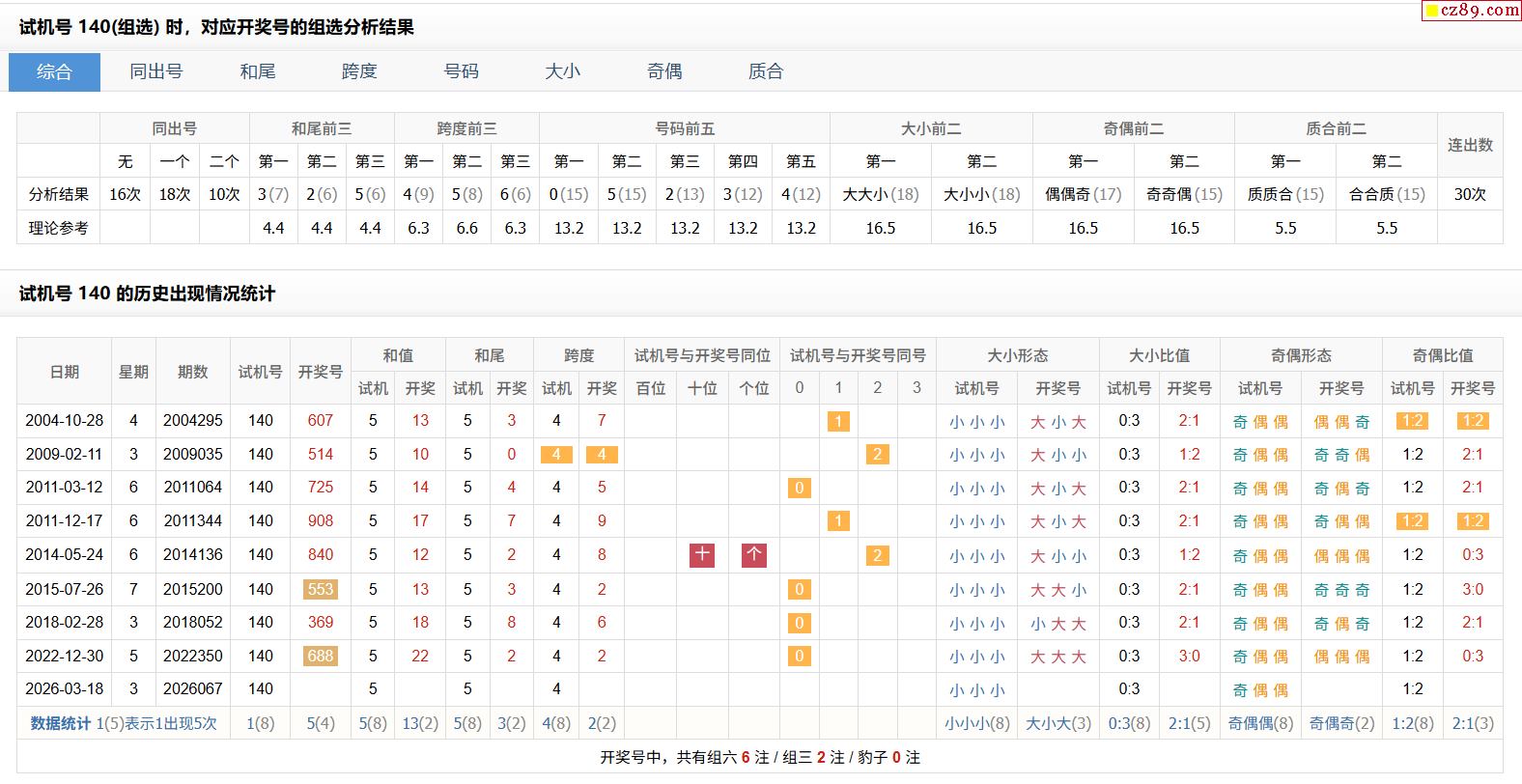 067期福彩3D试机号140对应开奖号的组选分析结果